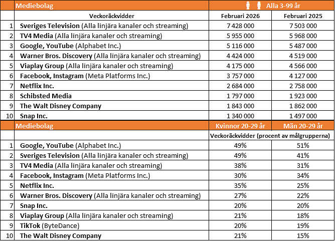Jämfört med januari ökar SVT och når i snitt en veckoräckvidd på 7,4 miljoner tittare (+ 382 000) och TV4 landar på 6,0 miljoner (+ 222 000). Uppgången drivs framför allt av den ökade räckvidden som vi ser under de två OS–veckorna. Trots tillväxten under OS ligger båda bolagen något under nivåerna från februari 2025.