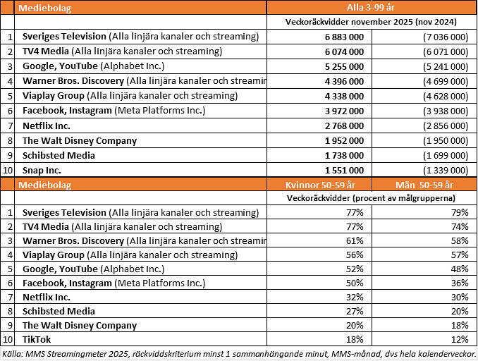 I åldersgruppen 50–59 år ser topplistan något annorlunda ut jämfört med yngre målgrupper. Här hamnar YouTube och Meta längre ner, medan Warner Bros. Discovery och Viaplay klättrar upp.